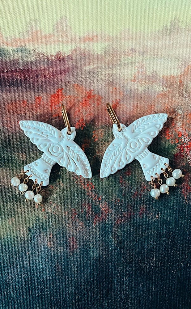 Sweet handmade white clay birds with tiny freshwater pearls and attached to gold rhodium coated surgical stainless steel earring huggies