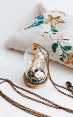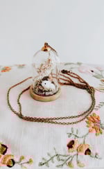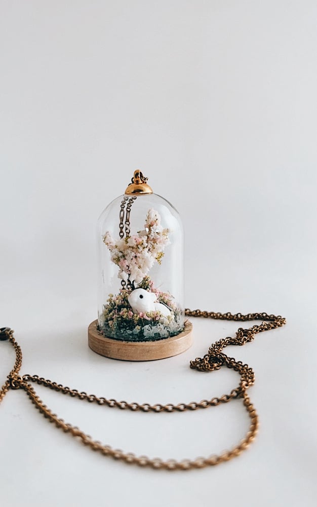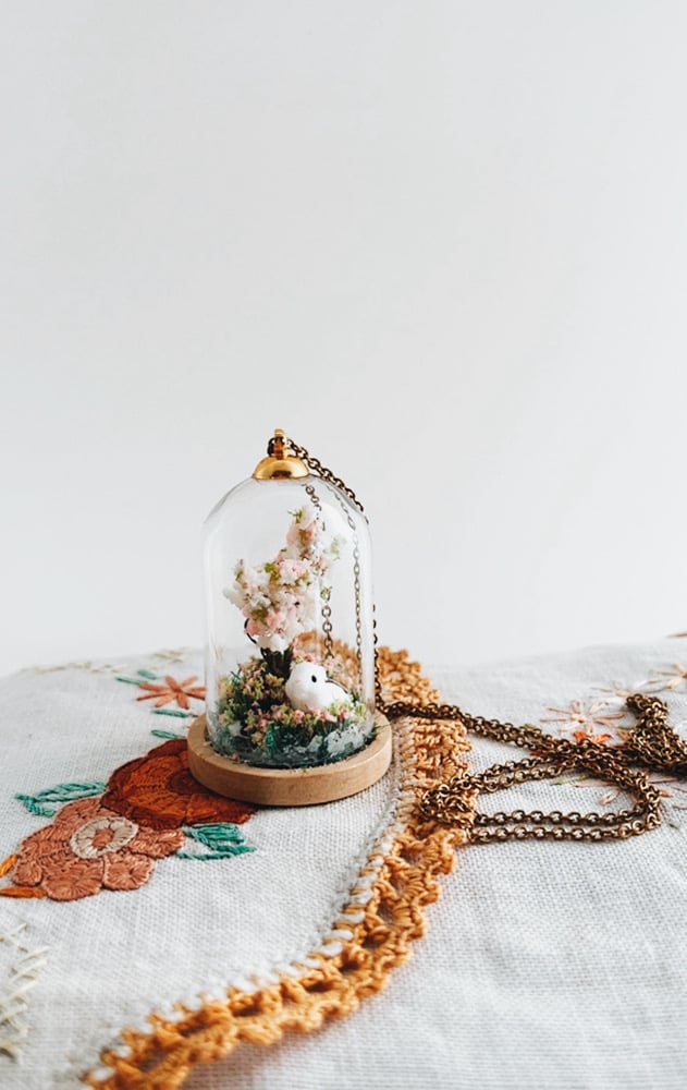 Whimsical handmade necklace featuring a white bunny surrounded by pastel foliage and a pastel toned tree. This adorable 3 dimensional scene is captured inside a tiny glass terrarium dome with a timber base. Threaded onto a long golden vintage chain.