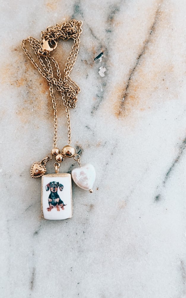 Adorable handmade necklace featuring a handmade clay tile with dachshund artwork, a freshwater pearl heart charm and a tiny golden heart charm. Strung onto a fine link chain