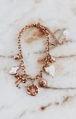 This one of a kind bracelet is loaded with charms from my collection attached to a gold rhodium coated stainless steel link style bracelet chain. Charms include a freshwater pearl heart and cross plus sweet hearts, bows, stars , suns and a large minimalist style hammered disc with crystal