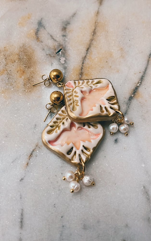Handmade clay tiles with hand painted peachy bird & foliage edged in 18k gold leaf and topped with a milky glossy glaze