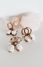 Handmade white clay charms with embossed French script and flourishes attached to small gold rhodium coated stainless steel huggies with tiny freshwater pearls